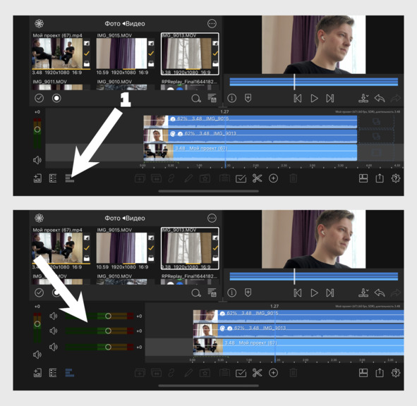 Несколько аудиодорожек также могут быть полезны: одну задействуем под музыку, вторую под голос, а остальные под, например, звуковые эффекты. Громкость каждой из них можно настраивать по отдельности. Для этого необходимо тапнуть по иконочке, помеченной стрелочкой 1 (см. рис. 11), чтобы раскрыть аудиомикшер (набор ползунков для управления уровнем громкости). Каждый из таких ползунков соответствует той дорожке, напротив которой находится (это касается как дорожек со звуком, так и дорожек с видео, в которых, напоминаю, тоже есть звук).