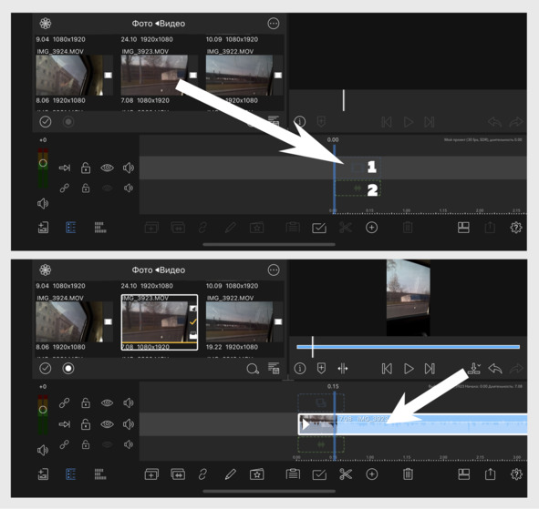 Однако работает она только на основной, самой первой видеодорожке. В случае, если вы решите добавить новые фрагменты на дорожки выше, то заметите, что там эффекта магнитной таймлинии нет вовсе. Тем не менее, чтобы отключить ее и на самой первой дорожке, тапаем по иконке, помеченной стрелочкой 1 (см. рис. 15).