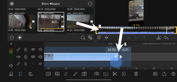 Если мы ухватим видео на таймлинии за край в начале или конце (стрелочка 1 на рисунке 13) и потянем, не отпуская пальца, то сможем подрезать его (либо в начале, либо в конце соответственно). Обратите внимание на окно предпросмотра (помечено стрелочкой 2 на том же рисунке), а если быть точным, то на шкалу под ним, где в момент подрезания будут отображаться совершаемые нами действия.