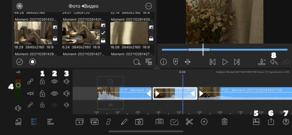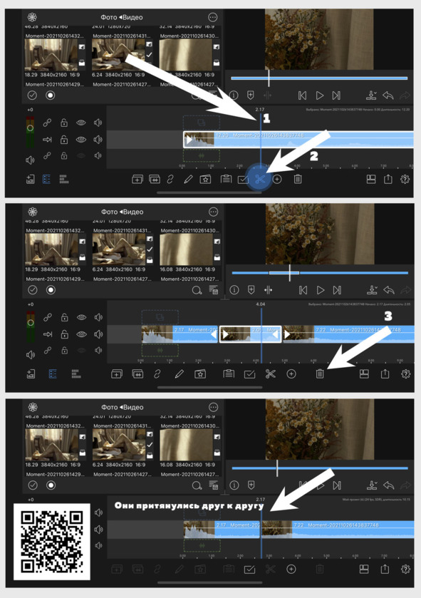 Предположим, что при помощи ножниц мы вырезали из добавленного нами видео какой-либо кусок. Затем выделили его, тапнув по нему пальцем, и удалили при помощи иконки корзины (помечена стрелочкой 3 на рисунке 14). После удаления мы заметим, что два других куска видео, оставшихся по бокам, словно примагнитило друг другу. Этот эффект и называется магнитной таймлинией.