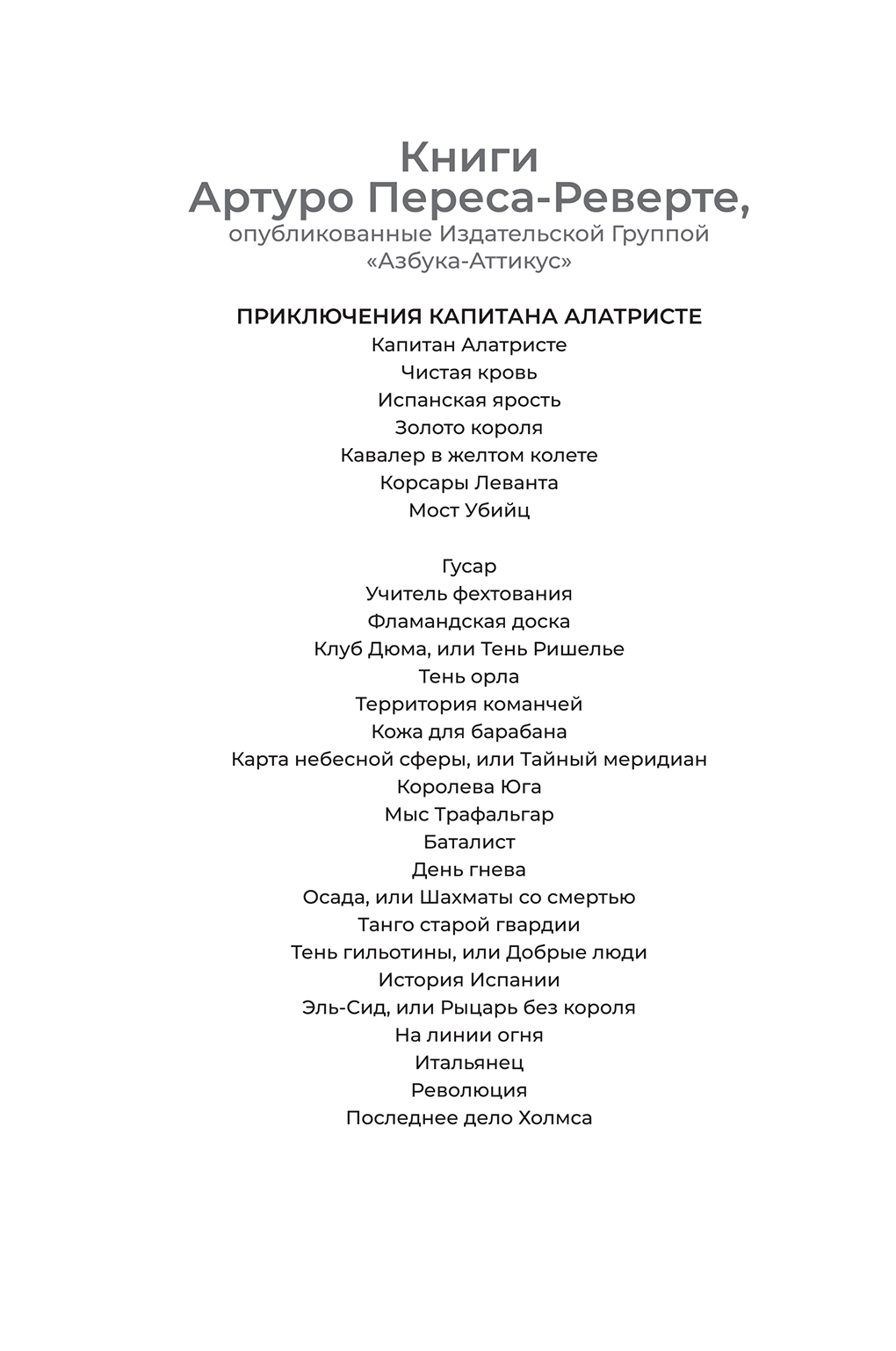 Avant-CritiqueВолшебство в том, как Артуро Перес-Реверте заставляет читателей вглядываться в глубины повествования, – он распахивает перед нами гобелен, сотканный из исторических фактов и ментальных координат прошлого. Это и вообще сложный трюк, но он граничит с виртуозностью, когда автор вдобавок преподносит нам жизненный и исторический урок под видом приключения, от которого невозможно оторваться.
