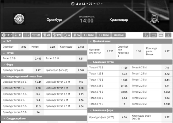 Если вы будете играть онлайн, то на сайте БК увидите, что-то вроде того, что изображено на рисунке_1. На рисунке представлена часть букмекерской линии, как в ней ориентироваться и понимать ее мы разберём в последней главе посвященной практической части. Линия БК очень важный критерий оценки уровня БК. Чем шире линия т.е. чем больше событий на ней представлено, тем более надежна и серьезна БК сама по себе. Поэтому не рекомендую Вам делать ставки в БК у которой маленькая линия.