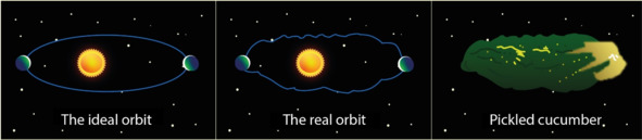 Then Kosmodemyan’s vision becomes spectrographic. The mode of the visible range of the eye switches to the spectrum of nitrogen and oxygen radiation4, as immediately the Earth’s atmosphere turns orange-red tones, and the ball itself becomes a semblance of its lifeless neighbor – Mars. Such an unflattering appearance, however, allows you to see the plume of atmospheric gases stretching behind the Earth. It exactly repeats the trajectory of the planet and (what a shame!) is a curved line in the form of a wave. This means that our common home is constantly oscillating in outer space, and its orbit is more of a wrinkled cucumber than a geometrically pretty ellipse.