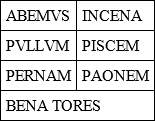 The meaning of this sign is double: it tells the customers that a good supper was always ready within, and that the gaming tables were always open to gamblers. The sign, in fact, is a tabula lusoria in itself, as shown by the characteristic arrangement of the thirty-six letters in three lines, and six groups of six letters each. Orthography has been freely sacrificed to this arrangement (abemus standing for habemus, cena for cenam). The last word of the fourth line shows that the men who patronised the establishment were the Venatores immunes, a special troop of Prætorians, into whose custody the vivarium of wild beasts and the amphitheatrum castrense were given.