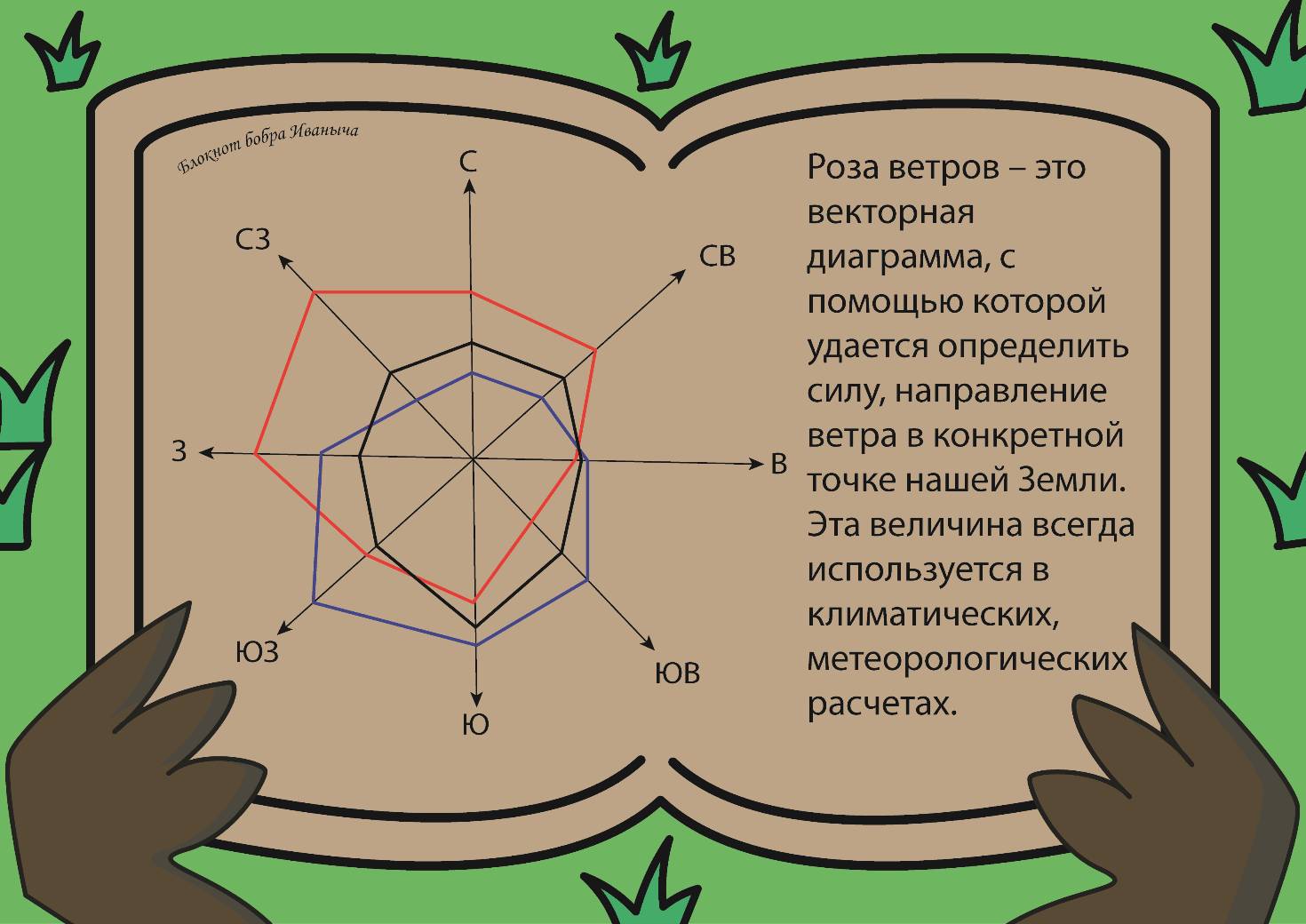 – Согласно моей розе ветров максимальный порыв ветра в зимнее время приходится с Запада. Вот мы ему навстречу глухую стену и сделаем. – бобер Иваныч нарисовал стрелку и развернул пенал, который использовал как модельку домика.– Ой, бобер Иваныч, гляди-ка – домишко то окошками на реку получается!!! Как я и хотел! Вот повезло! Какая Роза полезная то оказалась. – радовался Чик, показывая лапкой на отверстия в пенале.