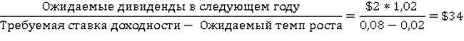 Рассмотрим простой пример. Предположим, вы оцениваете акции, по которым в прошлом году было выплачено $2 дивидендов. Вы ожидаете, что дивиденды будут расти на 2 % в год неограниченно долго, а требуемая ставка доходности для инвестирования в эти акции с учетом их риска составляет 8 %.