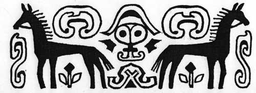 Старичок, прежде всего, одет был совершенно не по-нашенски. Тёплый азиатский халат тёмно-синего цвета, похожий на долгий до пят кафтан, выцветший от старости, ещё хранил на себе едва различимые контуры золотистой вышивки из диковинных зверей и птиц. Особенно на спине явно угадывались очертания скачущего во весь опор коня. Когда дедок приостанавливался, чтобы перекинуть с плеча на плечо свой чёрный мешок, конь двигался со складками халата и, казалось, начинал бег, что вызвало восторг увязавшихся мальчишек. В свободной руке путник нёс две деревянные палки длиной в свой рост. Палки напоминали детских деревянных коняшек-скакалок, чтоб в будёновцы играть. Они начинались конскими резными головами, а заканчивались почти настоящими хвостами, накрепко привязанными к концу палок кожаными шнурами. Маленькие колокольчики на палках, размещённые по всей длине, весело звенели, собирая всеобщее внимание. Надо заметить, что некоторые глухие перезвоны и стуки доносились иногда и из мешка, но, что там хранил приезжий азиат, оставалось для всех загадкой. А вот голову незнакомца венчала обычная тёплая солдатская ушанка.