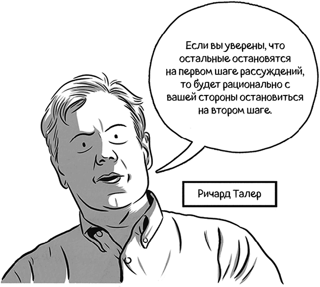 Тем не менее если имеет место общеизвестность рациональности игроков, если вы знаете, что остальные не остановятся на первом шаге, то можете бесконечно продолжать такоеитеративное рассуждение – процесс логического размышления, который включает повторение одного и того же действия, при котором результат одного этапа берется за отправную точку следующего.