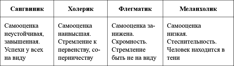 Люди с высокой самооценкой более ответственны, что усиливает их чувство причастности к группе. Человек доверяет самому себе. Вокруг него формируется атмосфера честности, ответственности, сострадания и любви. Человек чувствует себя важным и нужным. Его сексуальность соответствует требованиям нравственности. Человек с высокой самооценкой приходит на помощь, к нему тянутся другие, такого человека любят. Самооценка также зависит от видов темперамента (табл. 3) и особенностей воспитания (табл. 4).