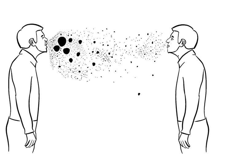 Зараженный выдыхает мелкие невидимые капли жидкости или чихает, вы вдыхаете эти капли и заражаетесь. А еще капельки могут попасть на слизистую глаз и заразить вас.