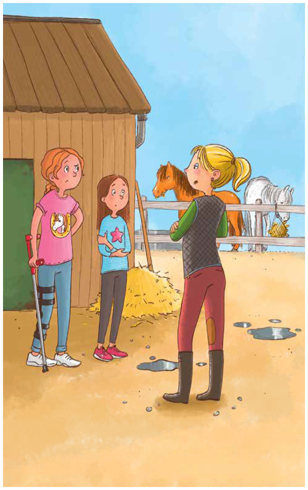 Когда Паула приезжала в гости к бабушке Луне, она часто наведывалась в «Солнечный двор», чтобы покататься на лошадях. Лотти иногда присоединялась и наблюдала, как старшая сестра ездит верхом. Но несколько месяцев назад Паула сломала ногу. Лошадь чего-то испугалась и сбросила наездницу, так что девочка до сих пор ходила в лонгете.