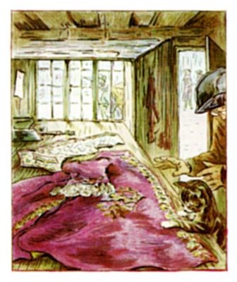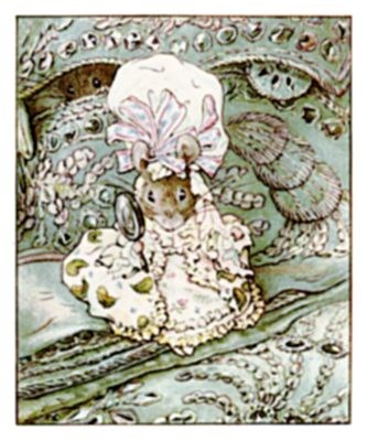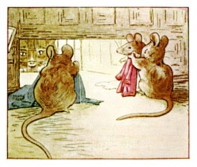 The little mice came out again, and listened to the tailor; they took notice of the pattern of that wonderful coat. They whispered to one another about the taffeta lining, and about little mouse tippets.