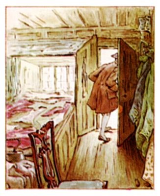 And then all at once they all ran away together down the passage behind the wainscot, squeaking and calling to one another, as they ran from house to house; and not one mouse was left in the tailor's kitchen when Simpkin came back with the pipkin of milk!