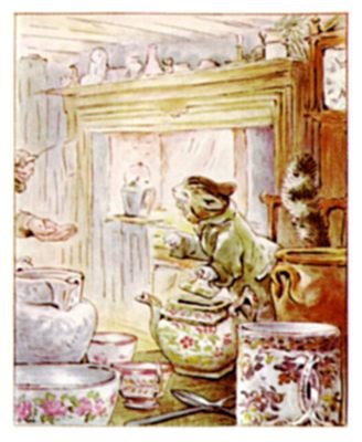 "Now what can that be?" said the Tailor of Gloucester, jumping up from his chair. The dresser was covered with crockery and pipkins, willow pattern plates, and tea-cups and mugs.