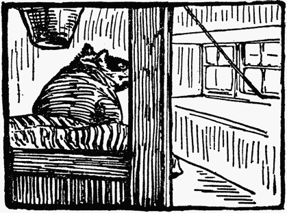 Old Mr. Bouncer, very sulky, was huddled up in a corner, barricaded with a chair. Flopsy had taken away his pipe and hidden the tobacco. She had been having a complete turn out and spring-cleaning, to relieve her feelings. She had just finished. Old Mr. Bouncer, behind his chair, was wondering anxiously what she would do next.