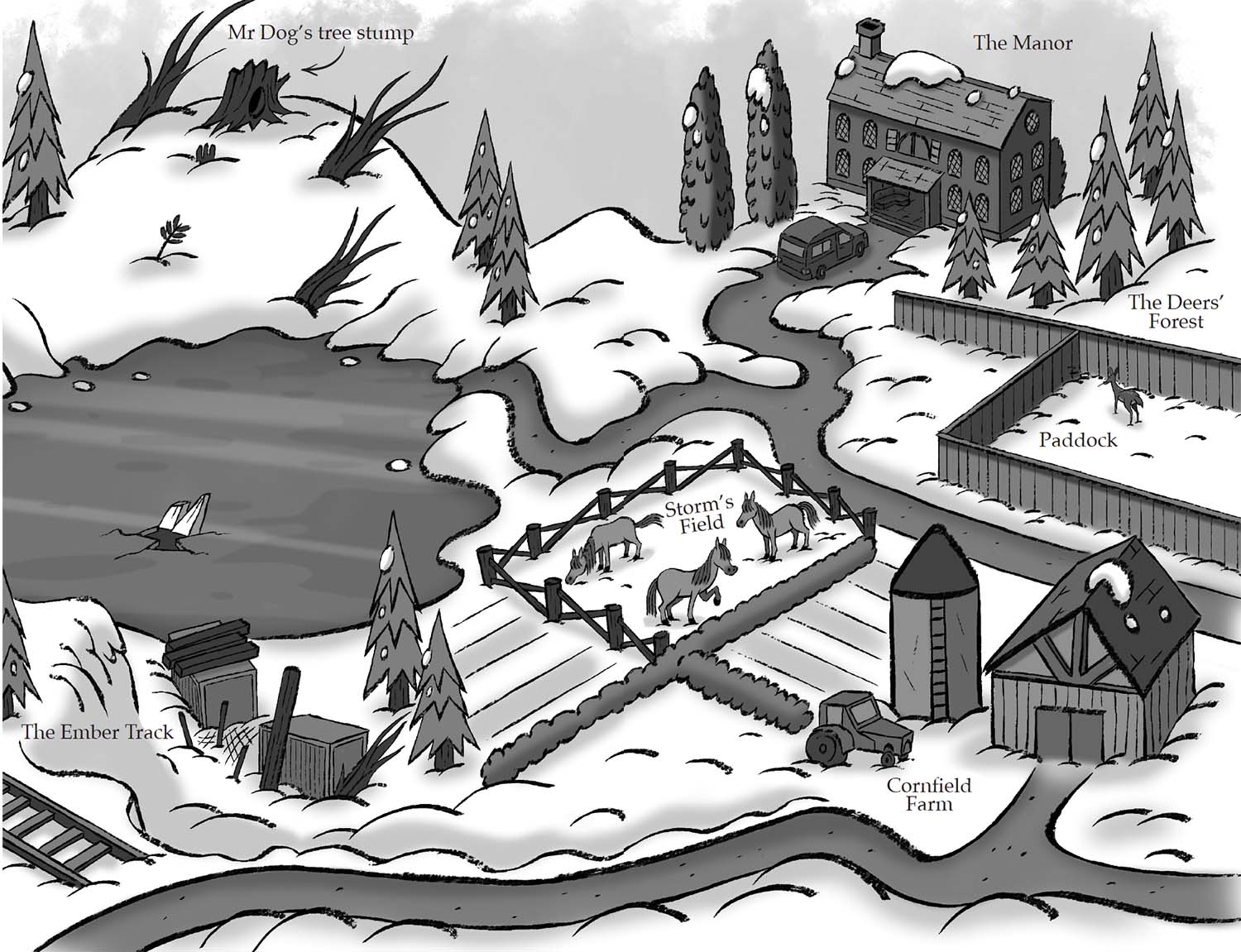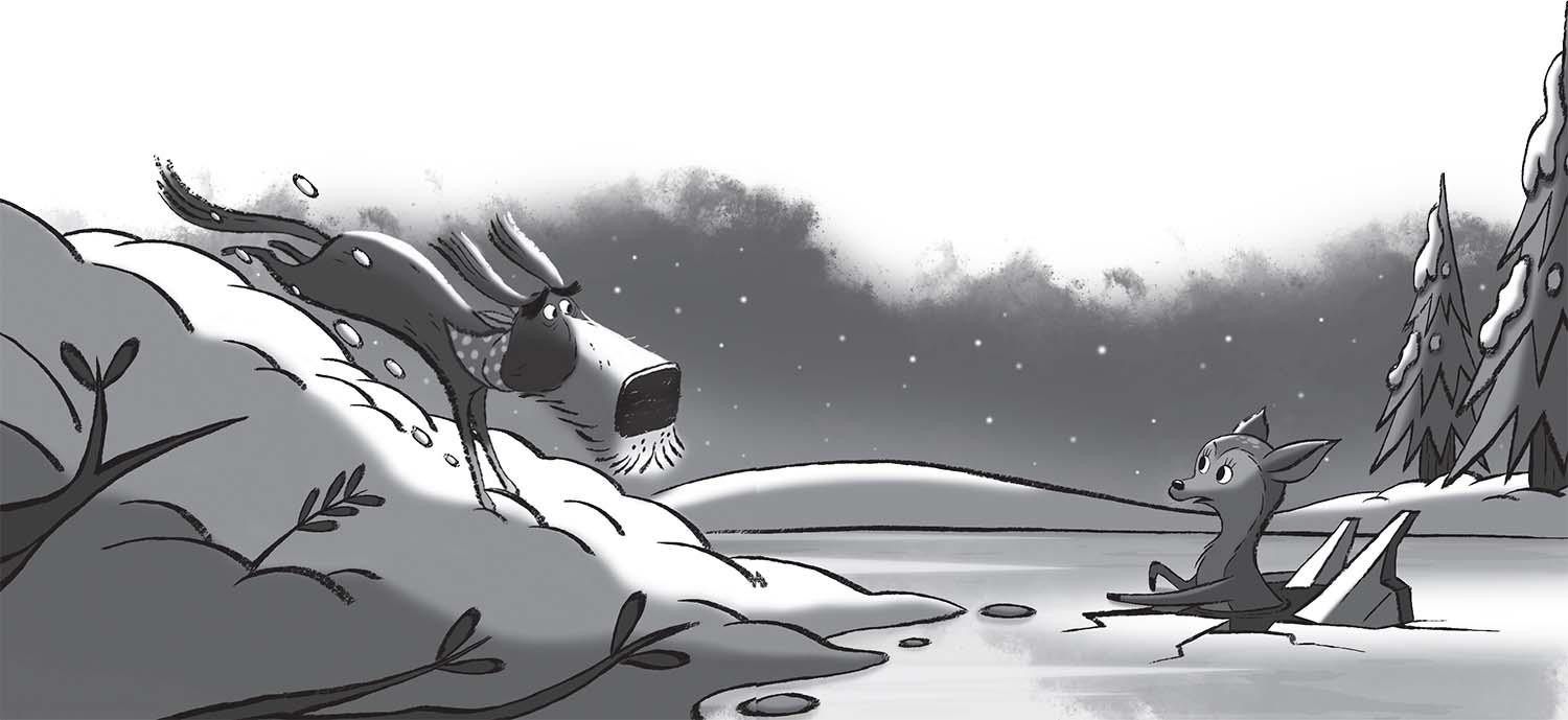 ‘Mr Dog to the rescue!’ he woofed. Digging his claws into the ice, he leaned forward and closed his teeth as gently as he could on the back of the fawn’s neck. Then he pulled with all his strength and hauled her clear of the water. Skinny legs kicking wildly, the fawn slithered out on to the ice. She lay there in a pile of pondweed, shivering.