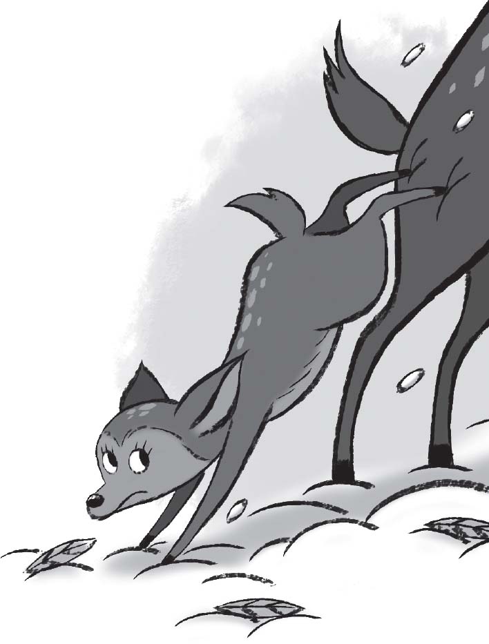 With an angry snort the second buck pushed past his opponent and charged at Bobbin. She gave a squeal and tried to spring aside. But the buck twisted his head and his antlers hit Bobbin like a strike from a shovel. She was sent tumbling through the snow and leaves – straight towards Mr Dog!