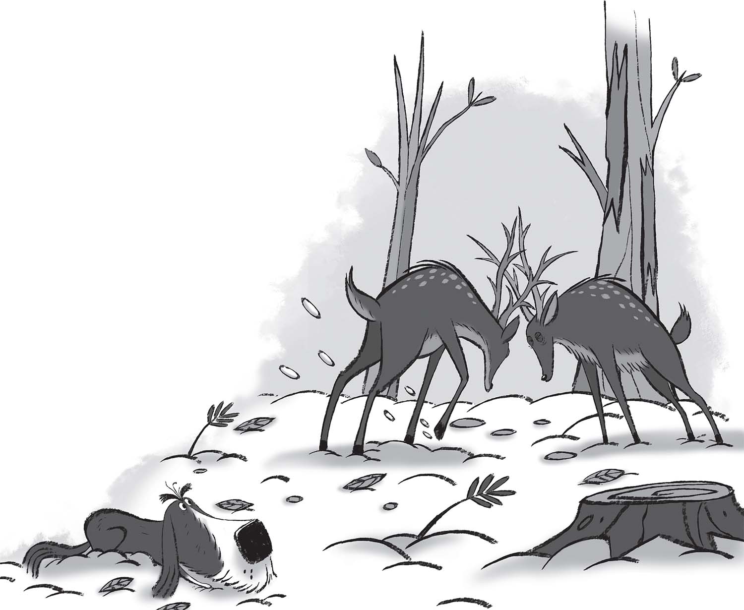 Mr Dog dropped down to his haunches and crawled like a shaggy commando through the snow and fallen leaves to see. Sure enough, two fallow bucks, reddy-brown with white spots, were slowly circling each other. Each had enormous antlers, like big bony trees sprouting from their heads. Suddenly one lowered his head and charged at the other. With a terrific clatter their antlers bashed together as each strained to push the other back.