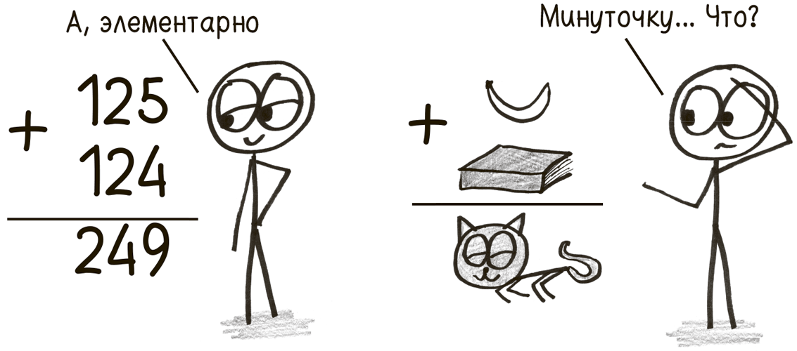 Мало кто осваивает 8 + 1 = 9 подобным образом. Но рано или поздно чуть ли не каждый, кто изучает математику, испытывает то же чувство дезориентации и прибегает к столь же отчаянным обходным маневрам. В детском саду, в средней школе или в аспирантуре – в конце концов замешательство настигает вас и математика становится, выражаясь словами математика Давида Гильберта, игрой с «бессмысленными закорючками на бумаге».