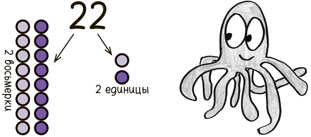 В самих десятках изначально нет ничего особенного. Просто так уж вышло, что мы происходим от обезьян с десятью пальцами на верхних конечностях. Если бы мы считали восьмерками, как могли бы предпочесть осьминоги или пауки, то обозначали бы «восемнадцать» как 22: две восьмерки плюс два в остатке.