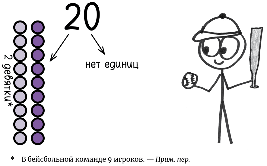 Или, если бы мы считали девятками, у нас получилось бы 20: два раза по 9 и ноль в остатке.