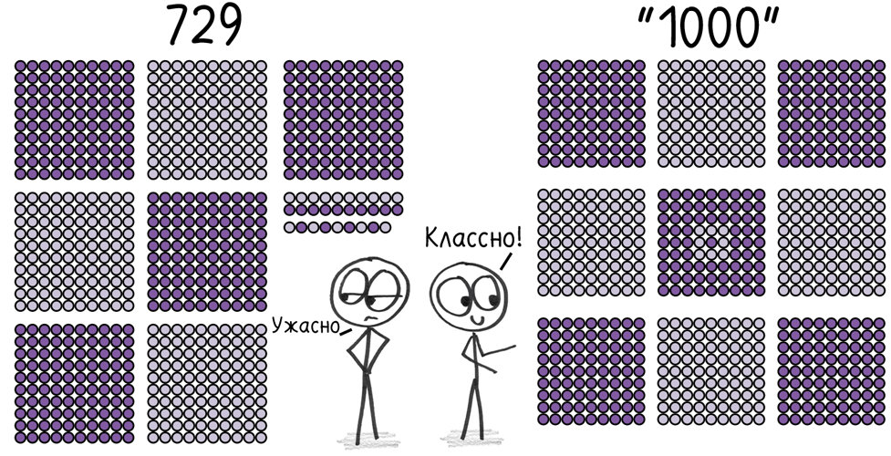 Между тем непримечательное 729 (семь групп по 10 × 10, две группы по 10 и девять в остатке) обернется прекрасным круглым числом 1000 – одной идеальной группой 9 × 9 × 9.