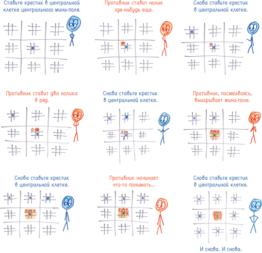 Иными словами, крестики жертвуют центральным мини-полем ради выигрышной позиции на оставшихся восьми. Я полагал, что эта стратегия весьма крута, пока читатели не указали мне на ее глубочайшую глупость. Гамбит Орлина дает небольшое преимущество, но его легко расширить до гарантированно беспроигрышной стратегии[7]. Вы можете пожертвовать не одним мини-полем, а двумя, завоевав при этом по два крестика на одной прямой на оставшихся семи мини-полях.