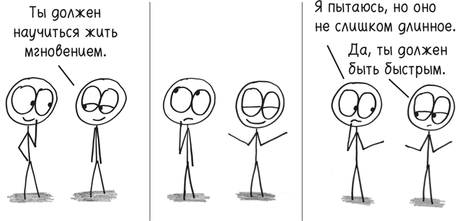 Философы в Древнем Китае играли в подобные игры разума. «То, что не поддается измерению, не может быть собрано в целое, – писал один из них. – Оно имеет размер в тысячу километров». В математическом смысле мгновение не имеет измерений. Оно не обладает ни длиной, ни протяженностью. Оно длится ноль секунд. Но, поскольку ноль, умноженный на ноль, равен нулю, два мгновения также составляют нулевое время. Это же относится и к десяти мгновениям, и к тысяче, и к миллиону. Получается, что любое исчисляемое количество мгновений будет в целом продолжаться ноль секунд.