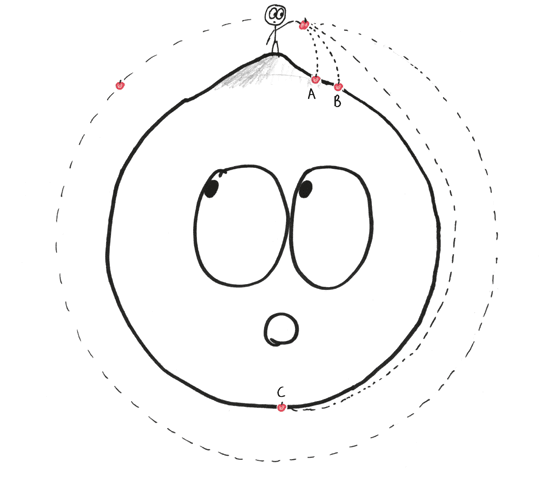 Бросьте яблоко по-настоящему сильно, как питчер «Ред Сокс» в сторону наглого игрока «Янкиз», и горизонтальное движение уведет фрукт от поверхности Земли, продлив падение. Возможно, он проделает весь путь до точки С.
