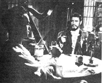 Черная тень внезапно возникает из-за угла кареты. Петра пронзительно визжит от страха. Кто-то поднимает руку, приближает бледное лицо с горящими глазами. Это лицо Xенрика. Он что-то говорит ей шепотом; глаза Петры широко раскрываются от удивления. Затем еще одна фигура, поменьше, возникает из тени за углом.