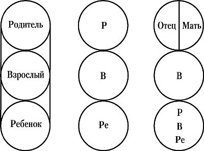 На рис. 1А представлена полная диаграмма личности, включая все, что чувствует и говорит человек, о чем он думает и что делает. (В упрощенной форме эта диаграмма показана на рис. 1Б.) Более тщательный анализ не открывает новые состояния Я, а только подразделяет первичные. Так, подобный тщательный анализ раскрывает в каждом случае два компонента Родительского Я: одно исходящее от отца, другое – от матери; в состоянии Ребенка также раскрываются компоненты Родителя, Взрослого и Ребенка, которые уже были налицо, когда фиксировался Ребенок, что можно подтвердить, наблюдая за реальными детьми. Этот вторичный, более углубленный анализ представлен на рис. 1В. Различение одного образца чувств и поведения от другого в состояниях Я называется структурным анализом. В дальнейшем состояния Я будут обозначаться Родитель (Р), Взрослый (В) и Ребенок (Ре) – с прописной буквы, тогда как родитель, взрослый и ребенок – со строчной буквы – относятся к реальным людям.