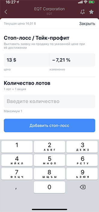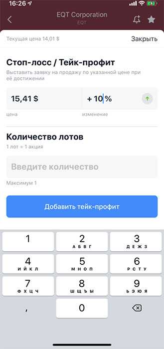 Я рассчитываю на ее рост и зафиксировать прибыль 10 % через какой-то промежуток времени. Я нажимаю на строку «+ Стоп-лосс/Тейк-профит». Дальше в графе изменения пишу «10 %». Как только цена достигнет значения 15,41, моя заявка будет выставлена брокером, и совершится продажа.