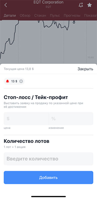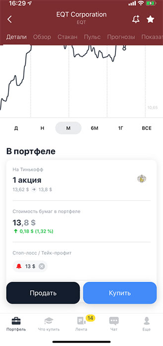 Ниже на примере у меня есть акция EQT, я ее купил по 13,62.