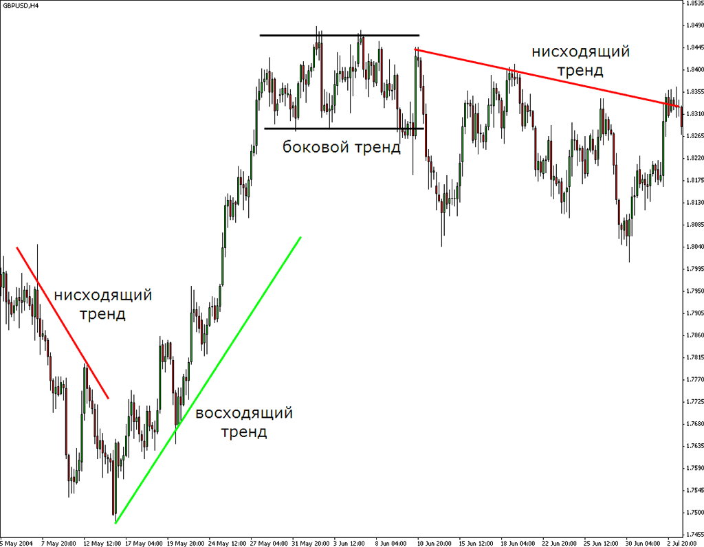Бывают три вида тренда: восходящий, нисходящий и боковой.