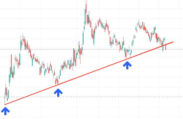 Восходящий тренд. Это когда строится линия, при которой значение каждого локального минимума больше предыдущего. На сленге это называется «бычий тренд».