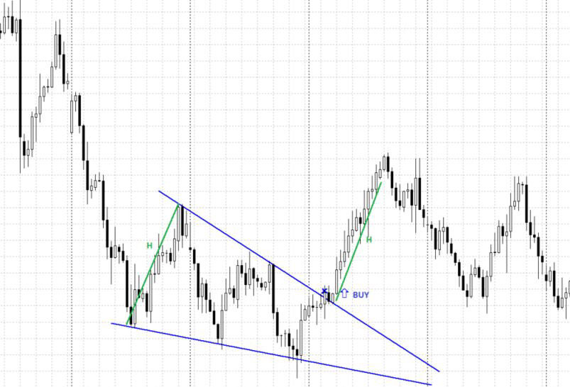 При нисходящем клине ждем, когда цена выйдет за пределы фигуры, и открываем покупку.