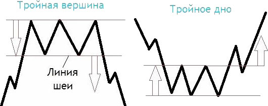 Тройная вершина и тройное дно отличаются от двойной вершины (дна) количеством пиков цены – их три. Тройные фигуры встречаются реже и являются более надежными.