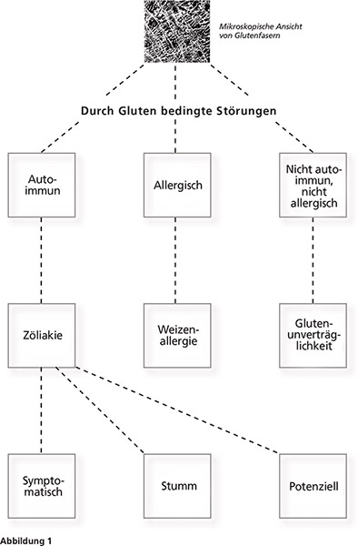 Bisher wurde die Zöliakie als die einzige schädliche Reaktion oder körperliche Erkrankung betrachtet, die durch Gluten verursacht wird. Doch 2010 wurden weltweit etwa 2 Milliarden Euro für glutenfreie Produkte ausgegeben. Diese Zahl zeigt, dass sich nicht nur die tatsächlich an Zöliakie Erkrankten glutenfrei ernähren. Was ist also los? Es hat sich eine relativ neue Erkrankung entwickelt, die Glutenunverträglichkeit.4 Abbildung 1 zeigt verschiedene Reaktionen auf den Genuss von Gluten. Zöliakie ist die eine, Glutenunverträglichkeit die andere Reaktion.