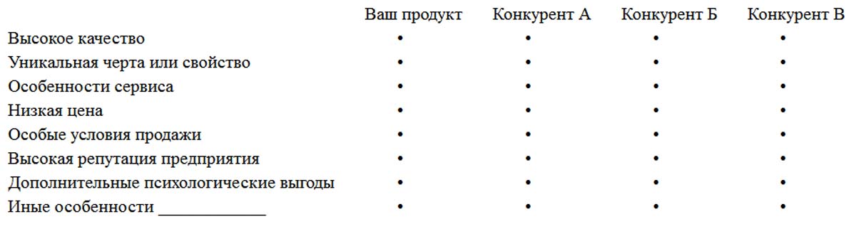 Воспользуйтесь приведенной ниже таблицей, чтобы определить УТП своего товара или услуги в сравнении с сильными сторонами конкурентов. Она наглядно покажет, в каких важных моментах ваша продукция отличается от продукции конкурентов и в чем ее уникальность.