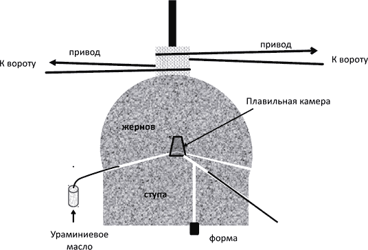Как объяснил Кузнец, плавильная камера располагалась в центральной выемке между жерновом и ступой. Трущиеся поверхности ступы и жернова были отполированы и смазаны растительным маслом, зато зазор между плавильной камерой и жерновом был заполнен песком – там и выделялось почти всё тепло от трения.