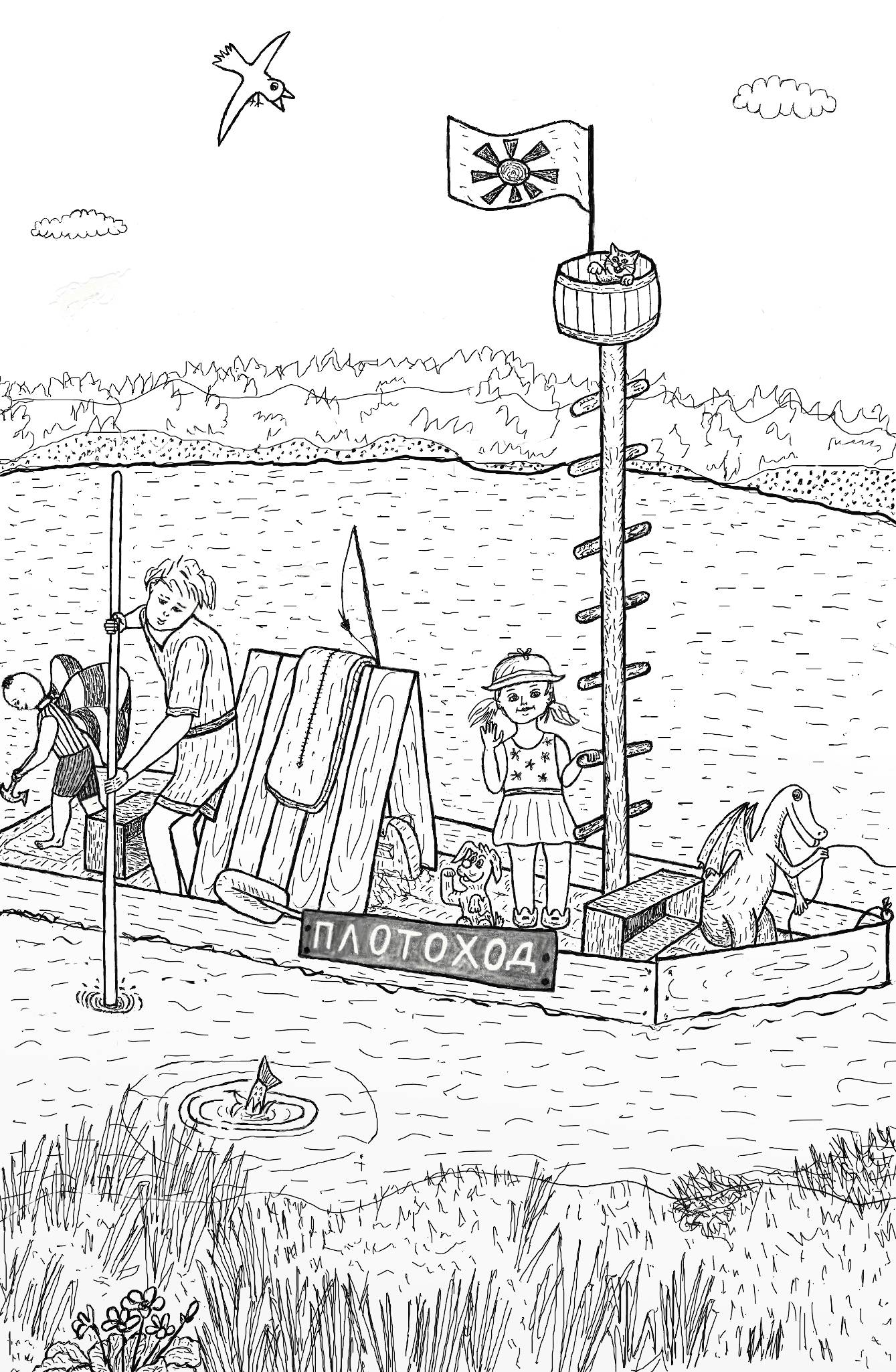 На следующее утро, на берегу собралась целая группа провожающих: две мамы и Светина бабушка, тётя Маша, дед Пахом, Коля, лошадка Маруся и телёнок Муня. Вся команда была уже на корабле. На его бортике красовалось имя – «ПЛОТОХОД», написанное белой краской. Кася выглядывал из бочонка и махал всем лапкой. Над ним развивался флажок с лучистым жёлтым солнышком посередине.