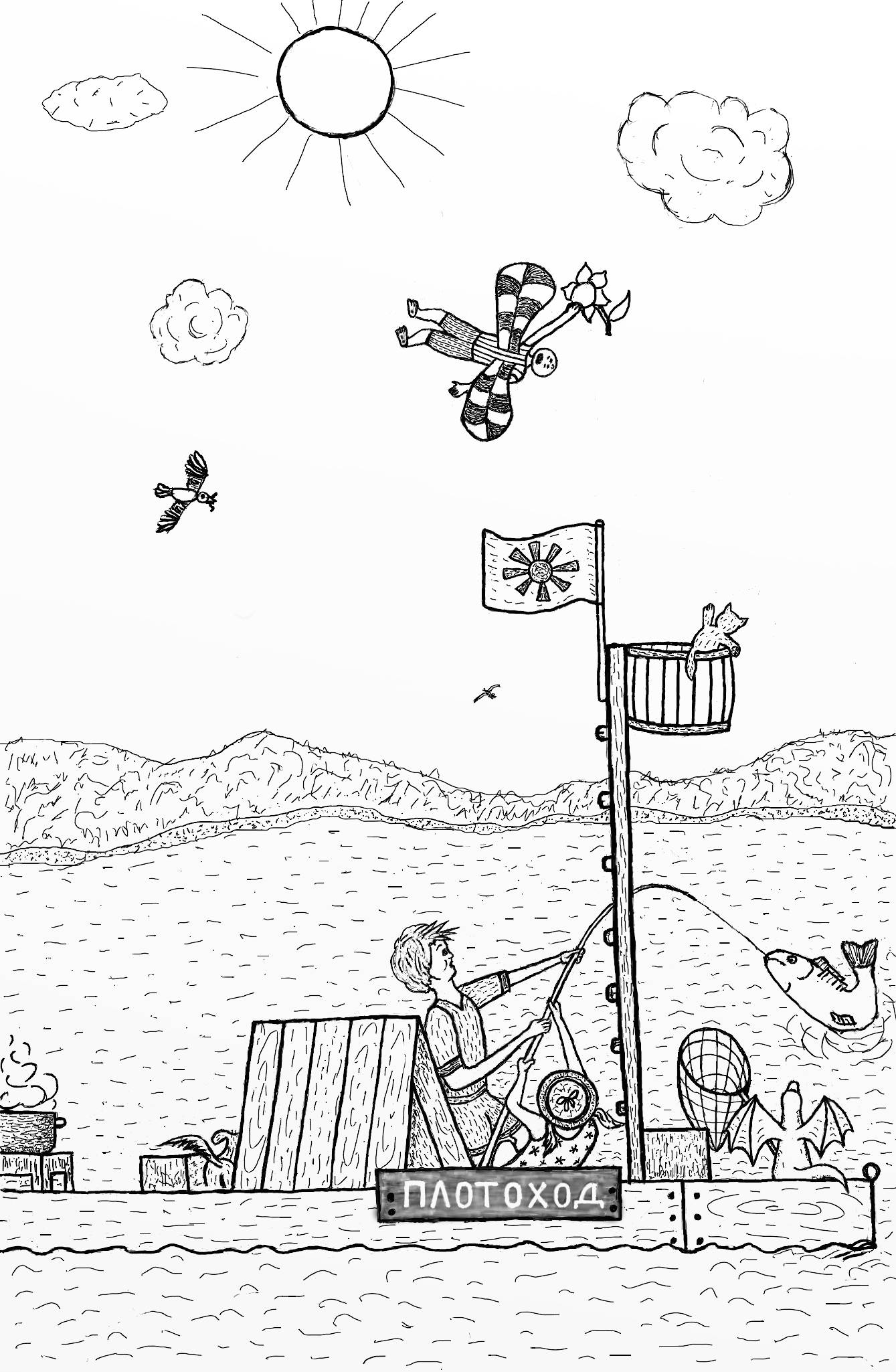 Провожающие тоже махали в ответ, кто одной, кто двумя руками, а кто и головой (это Маруся и Муня так провожали). Букася поднимал якорь, а Дракоша сматывал верёвку на носу корабля. Ещё несколько усилий и течение подхватило его. «ПЛОТОХОД» отправился в плавание.