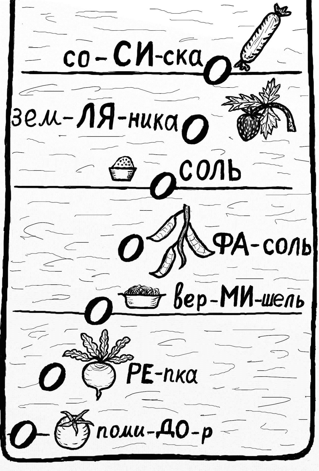 – Помидор – ДО, репка – РЕ, вермишель – МИ, фасоль – ФА, соль – СОЛЬ, земляника – ЛЯ, сосиска – СИ.