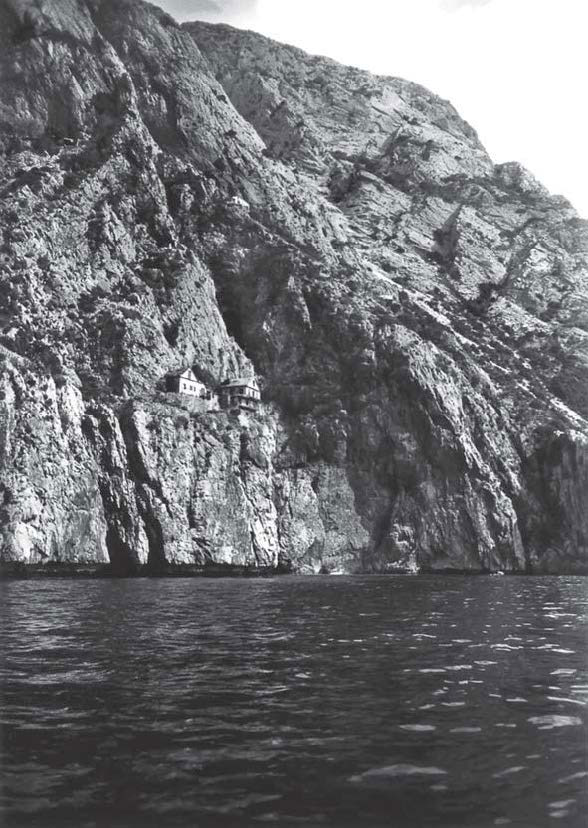Временами высоко наверху видишь домик, это «калива» пустынника, одиноко висящая над бездной. Головокружительные тропинки проложены по утесам. Отшельники не боятся ходить по ним в темноту после всенощной (из ближнего скита). В одном месте я видел веревку, натянутую по краю пропасти – это перила скользящей тропки. Далее тропка уходит в косую проточину в скале, подобную водопроводной трубе, по ней сползают к более низкому месту.
