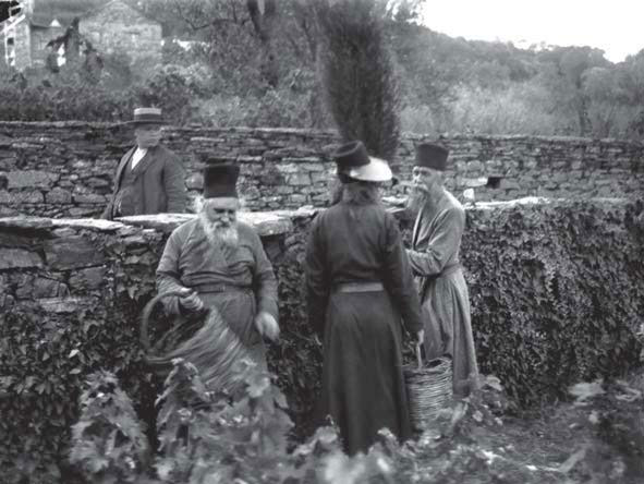 // [35] 26 мая, четверг. Встаю в 6 [174]/2 (по европейски), еще лежа в постели слышу доносящуюся службу и ответы хора „Господи помилуй“ – это где-ниб.[удь] в ближнем параклисе кончается ранняя литургия. Читаю Успенского[175], делаю выписки. Патерик[176]. Жизнь св. Афанасия Афонского[177]. В 9 ч. Мне подают уж обед. В 10 идем с о. Пинуфрием к о. Науму сниматься. Затем он (о. П.[инуфрий]) показывает мне монастырскую лесопилку. В огромном корпусе локомотивчик привод.[ит] в движе- // [35 об.] ние лесопильн.[ую] машину в три вертик.[альные] пилы. При нас распилив.[ают] дубок вдоль – средина идет на шпалы. Работают монахи здесь по 10 ч., во второй полов.[ине] дня работа будет сопровождаться чтением Псалтири, взамен слушания вечерни. Идем на мон.[астырский] огород („кипер“). Около 2 [178]/2 дес.[ятин] земли. Фасоль, лук, огурцы, петрушка и т. п. Показывает нам помощник заведующего, молодой монашек о. Владимир, с редкой, боро легкой бородкой, рыжеват.[ого] цвета, такими-же усиками и теми добрыми и слегка застенч.[ивыми] глазами, которых уже столько я видел здесь. Это беже- // [36] нец.