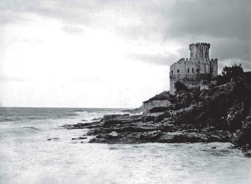// [9 об.] 19 мая, 2. ч.[аса] дня. Идем в лодке под парусом. Правят два албанца, монаха. Слабый ветер. Припекает. Только что прошли келлию св. Артемия[161] и Воздвижения Креста. Монастырь Каракалл[162]. У самой воды „Пирг“ (башня)[163]. К-[аракалл]ского монастыря. Туда укрывались, когда налетали с моря пираты. Древняя башня, средневековая.