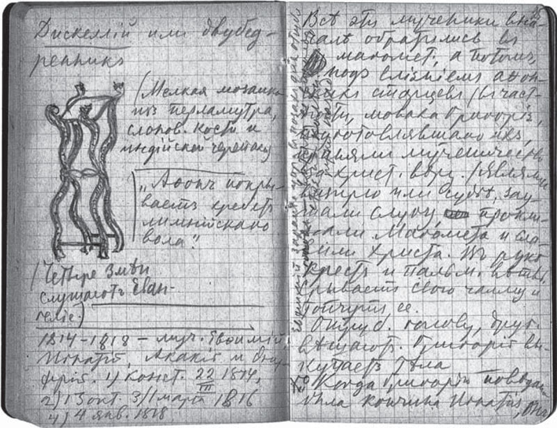 [20] нец, доходим до каливы пустын о. Нила. Вылезает старичек со слезящимися глазами. Вокруг его каливы виноградничек и растут фиговые деревья. Он очень тих, едва ворочает языком. Хочет угостить фигами, идет, роется, потом смущенно докладывает, что нам не могут понравиться его смоквы. Впоследствии, от правожатого [sic!] нашего, о. Петра, узнаю, что питается старец почти исключительно „камарней“ и гнилыми фигами, запасы кот. [орых] делает на год. (О. Петр сам оч.[ень] интерес- // [20 об.] ный и замеч.[ательный] человек, оч.[ень] застенч.[ивый] и некрасивый, со слипшимися волосенками, маленькими, полными „доброго“ ветра глазками, редкой, нелепой бороденкой. Весь день он работает на кипере, ночью поет на клиросе в церкви. Работает так много, что у него „кровь пошла, значит, моя унутренность доктор сказал, не в порядке, чтой-то в сродке неладно, и велел мне неделю ничего не делать“. О. Петр спит 1–2 ч.[аса] в сутки. Время, свободное от работ и пения прово- // [21] дит в ко келии за чтением. Этот смиренный и замечательный облик, м.[ожет] б.[ыть] за таких Господь милует тысячи).