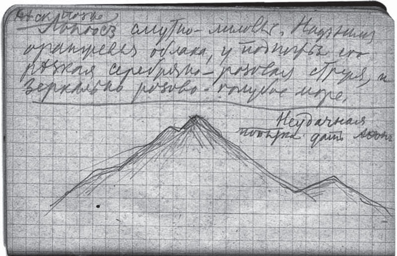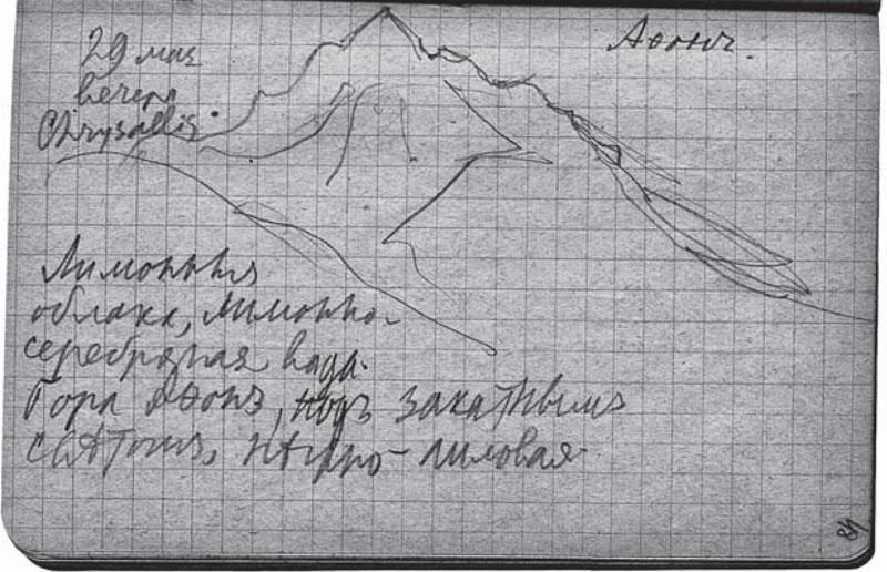 29 мая, вечер. Chrysallis. Афон. Лимонные облака, лимонно-серебряная вода. Гора Афон под закатным светом, нежно-лиловая. (Записная книжка, л. 48).