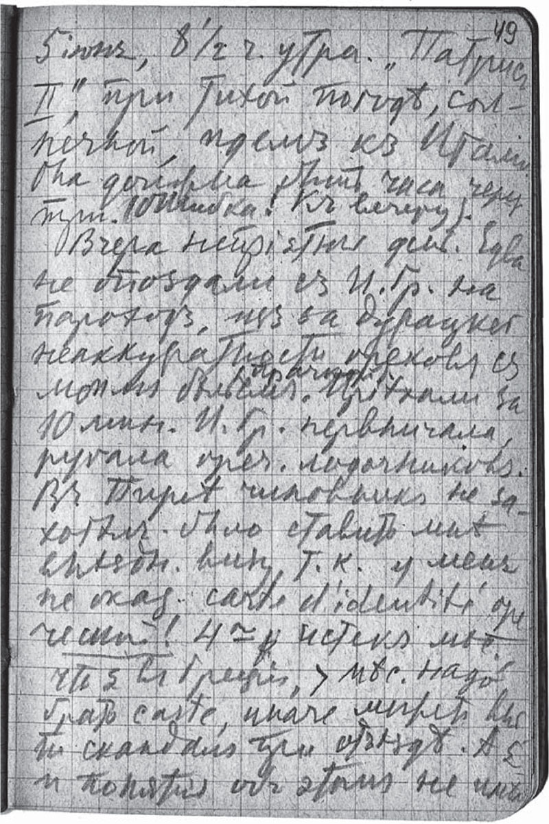 // [49] 5 июня., 8 1/2 ч. утра. „Патрис II“, при тихой погоде, солнечной, идем к Италии. Она должна быть часа через три. (Ошибка! К вечеру).