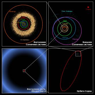 Предполагаемое расстояние до облака Оорта по сравнению с остальной частью Солнечной системы (в т.ч. с Поясом астероидов и с Поясом Койпера), изображение из статьи Википедии «Облако Оорта» (Автор: Oort_cloud_Sedna_orbit.svg: * Image courtesy of NASA / JPL-Caltech / R. HurtOriginal text courtesy of NASA / JPL-CaltechSVG conversion by Holekderivative work: Skab (ta lk) – Oort_cloud_Sedna_orbit.svg, Общественное достояние, https://commons.wikimedia.org/w/index.php?curid=8557233)
